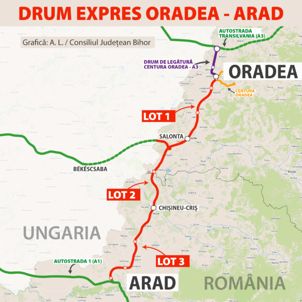 Contractele pentru primele două loturi ale Drumului Expres Arad – Oradea au fost semnate pe parcursul anului 2025. Lotul 1, Oradea – Salonta, cu o lungime de 33,7 kilometri, la care se adaugă drumul de legătură cu DN 79 – Salonta, de 5,3 kilometri, este realizat de Asocierea Precon Transilvania SRL – Automagistral Pivden SRL, valoarea contractului fiind de 2,32 miliarde de lei, fără TVA. În vestul municipiului Oradea, acest lot va include cel mai aglomerat nod rutier din județul Bihor, unde se vor intersecta Drumul Expres Arad – Oradea, Centura Oradea și drumul de legătură către Autostrada Transilvania.