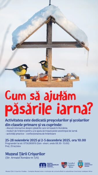 Muzeul Țării Crișurilor Oradea – Complex Muzeal organizează, împreună cu Consiliul Județean Bihor și Primăria Municipiului Oradea, atelierul de educație muzeală Cum să ajutăm păsările iarna? Acesta se va desfășura în perioada 25-28 noiembrie 2025 și 2-5 decembrie 2025, orele 10:00-11:00, la sediul instituției (Str. Armatei Române nr. 1/A).