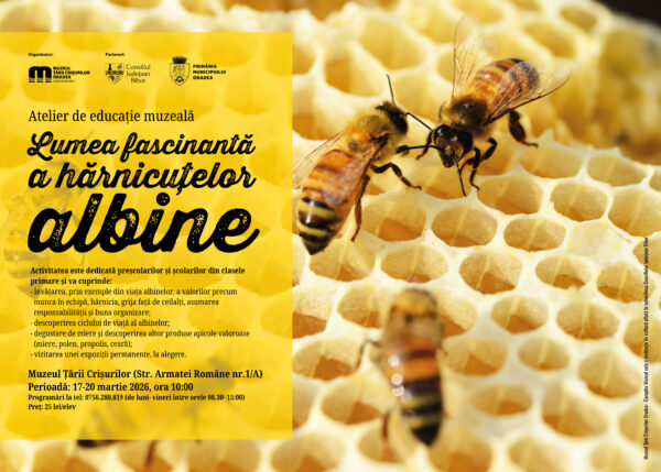 Atelierul, intitulat „Lumea fascinantă a hărnicuțelor albine”, se va desfășura în perioada 17–20 martie 2026, începând cu ora 10:00, la sediul muzeului din Oradea, pe strada Armatei Române nr. 1/A.