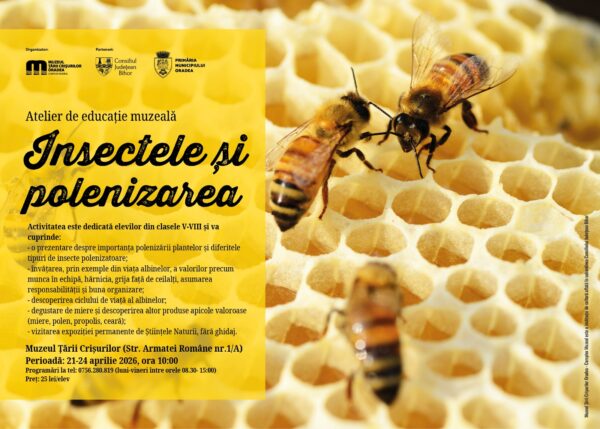 Muzeul Țării Crișurilor Oradea – Complex Muzeal, în parteneriat cu Consiliul Județean Bihor și Primăria Municipiului Oradea, organizează în perioada 21-24 aprilie 2026, atelierul de educație muzeală „Insectele și polenizarea”. Activitatea va avea loc zilnic, de la ora 10:00, la sediul muzeului de pe Str. Armatei Române nr. 1/A.