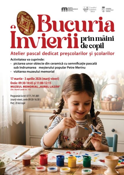 În cadrul atelierului, copiii vor avea ocazia să picteze obiecte din ceramică cu tematică pascală – ouă decorative, cruci cu răstignirea, reprezentări ale Mântuitorului sau puișori de găină – sub îndrumarea meșterului popular Petre Merinu din comuna Roșia, Bihor. De asemenea, programul include și vizitarea muzeului memorial.