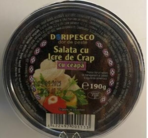 Este vorba despre SALATĂ DE ICRE DE CRAP 190 g, lotul 05.09.2025, cu termen de valabilitate 20.10.2025.
