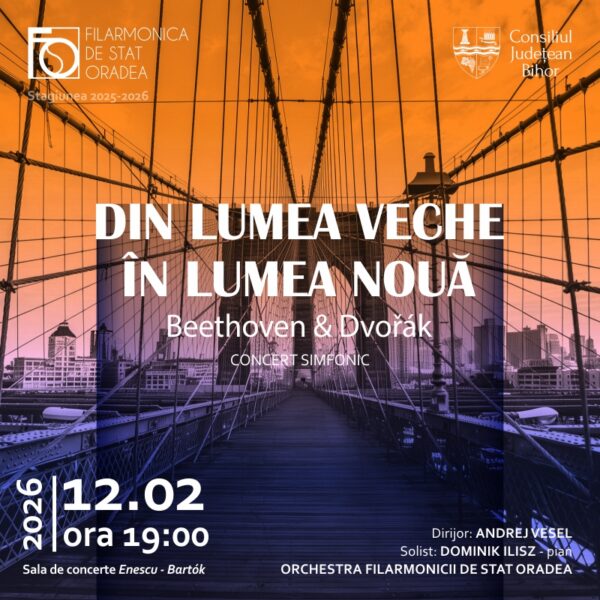Filarmonica de Stat Oradea propune publicului bihorean, joi, 12 februarie 2026, de la ora 19:00, un concert simfonic de excepție, care aduce față în față două dintre cele mai importante creații din istoria muzicii clasice. Evenimentul, intitulat sugestiv „Din lumea veche în lumea nouă”, va avea loc în Sala de concerte „Enescu – Bartók” și marchează totodată 185 de ani de la nașterea compozitorului ceh Antonín Dvořák.