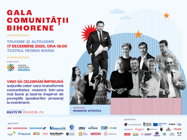 Fundația Comunitară Oradea invită bihorenii la Gala Comunității Bihorene, ediția 7.0. Toni Grecu, Gelu Duminică, Sara Turetta, Ana Poenariu, Dr. Dănuț Dejeu, Magor Csibi și Mircea Pricăjan vor urca pe scenă în calitate de speakeri. Bilete pot fi achiziționate aici. Evenimentul are loc miercuri, 17 decembrie, începând cu ora 18.00, în sala Teatrului Regina Maria.