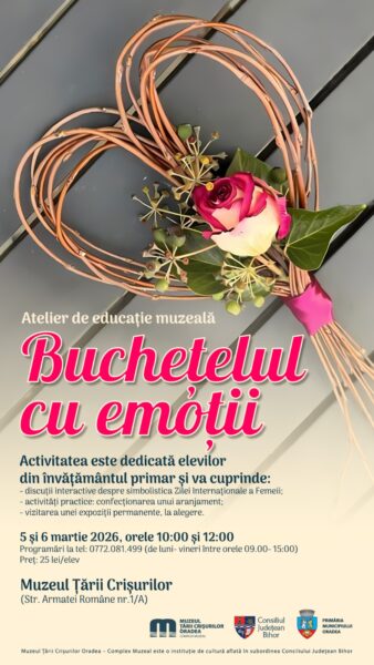 Muzeul Țării Crișurilor – Complex Muzeal Oradea, cu sprijinul Consiliului Județean Bihor și al Primăriei Municipiului Oradea, organizează atelierul de educație muzeală „Buchețelul cu emoții”, dedicat elevilor din clasele primare. Evenimentul va avea loc pe 5 și 6 martie, la orele 10:00 și 12:00, la sediul muzeului de pe Strada Armatei Române nr. 1/A.