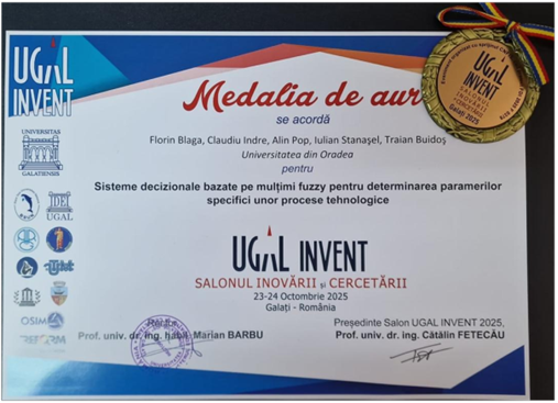 Lucrarea intitulată Development of Fuzzy Set-Based Decision Systems for Determining Technological Process Parameters (Sisteme decizionale bazate pe mulțimi fuzzy pentru determinarea parametrilor specifici unor procese tehnologice) a fost distinsă cu medalia de aur.