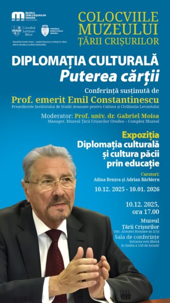 Muzeul Ţării Crişurilor Oradea – Complex Muzeal, în parteneriat cu Consiliul Județean Bihor și Primăria Municipiului Oradea, organizează un nou eveniment de excepție în cadrul Colocviilor Muzeului Țării Crișurilor: conferința Diplomația culturală. Puterea cărții, susținută de prof. emerit Emil Constantinescu, Președintele Institutului de Studii Avansate pentru Cultura și Civilizația Levantului.