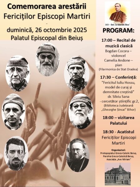 Duminică, 26 octombrie 2025, de la ora 17.00, se va desfăşura în Palatul Episcopal din Beiuș la evenimentul de Comemorare a arestării Fericiților Episcopi Martiri.