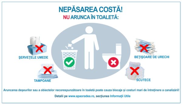 Compania de Apă Oradea face un apel către populație să urmeze regulile de bun simț și să nu arunce deșeuri în toaletă. În acest sens, operatorul a trimis deja informări pe spatele facturilor tipărite, pe site-ul și pe paginile de socializare proprii, precum și pe autoutilitare, unde vor fi lipite autocolante care atrag atenția că aruncarea deșeurilor în toaletă este interzisă. În același timp, CAO îi îndeamnă pe utilizatori să sesizeze orice avarie a sistemelor de alimentare cu apă și de canalizare prin numărul unic de Call Center – 0359 996.