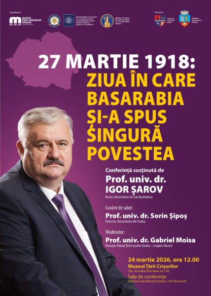 Evenimentul, intitulat „27 Martie 1918 – Ziua în care Basarabia și-a spus singură povestea”, va fi susținut de istoricul Igor Șarov și va avea loc de la ora 12:00, în sala de conferințe a muzeului din Oradea.