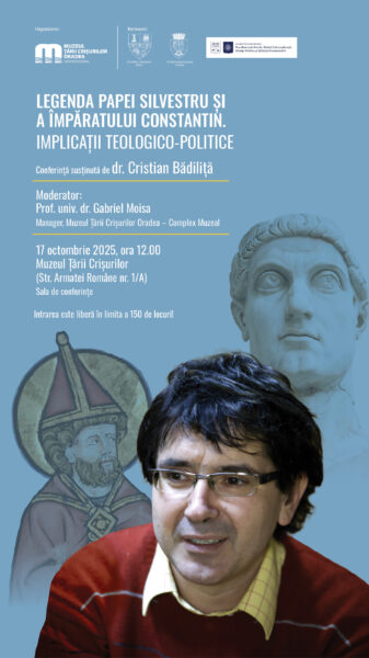 Muzeul Țării Crișurilor Oradea – Complex Muzeal, în parteneriat cu Consiliul Județean Bihor, Primăria Municipiului Oradea și Facultatea de Istorie, Relații Internaționale, Științe Politice și Științele Comunicării a Universității din Oradea, organizează conferința intitulată „Legenda Papei Silvestru și a Împăratului Constantin. Implicații teologico-politice”, susținută de dr. Cristian Bădiliță. Evenimentul va avea loc vineri, 17 octombrie, ora 12.00, în Sala de conferințe a Muzeului Țării Crișurilor (Str. Armatei Române nr.1/A) și va fi moderat de către prof. univ. dr. Gabriel Moisa, manager al Muzeului Țării Crișurilor Oradea – Complex Muzeal.