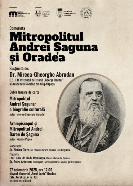 Muzeul Ţării Crişurilor Oradea – Complex Muzeal organizează, în parteneriat cu Consiliul Județean Bihor, Primăria Municipiului Oradea și Editura Școala Ardeleană, conferința Mitropolitul Andrei Șaguna și Oradea, susținută de dr. Mircea-Gheorghe Abrudan, C.S. II la Institutul de Istorie „George Barițiu” al Academiei Române din Cluj-Napoca. Evenimentul va avea loc joi, 27 noiembrie 2025, ora 12.00, la Muzeul Memorial „Aurel Lazăr” Oradea (Str. Aurel Lazăr nr. 13).