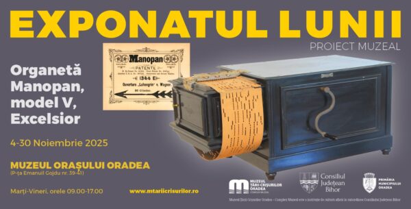 Exponatul lunii noiembrie este un aparat muzical, Organetă Manopan, model V, Excelsior, clasat în categoria Tezaur și care va putea fi admirat la Muzeul Orașului Oradea (P-ța Emanuil Gojdu nr. 39-41), Sala cu grifoni, începând cu data de 4 noiembrie a.c., în intervalul orar 09.00-17.00.