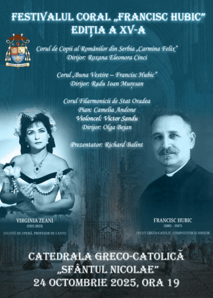 Episcopia Română Unită cu Roma, Greco-Catolică de Oradea vă invită vineri, 24 octombrie 2025, ora 19:00, în Catedrala Greco-Catolică „Sfântul Nicolae”, la cea de-a XV-a ediție a Festivalului Coral „Francisc Hubic”.