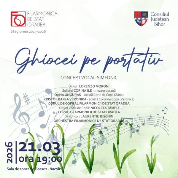Filarmonica de Stat Oradea invită publicul orădean la un eveniment special de primăvară: concertul vocal-simfonic „Ghiocei pe portativ”, care va avea loc sâmbătă, 21 martie 2026, de la ora 19:00, în Sala de concerte „Enescu – Bartók”. Evenimentul aduce pe scenă atât copii, cât și artiști cu experiență, într-un program diversificat care sărbătorește primăvara prin muzică.