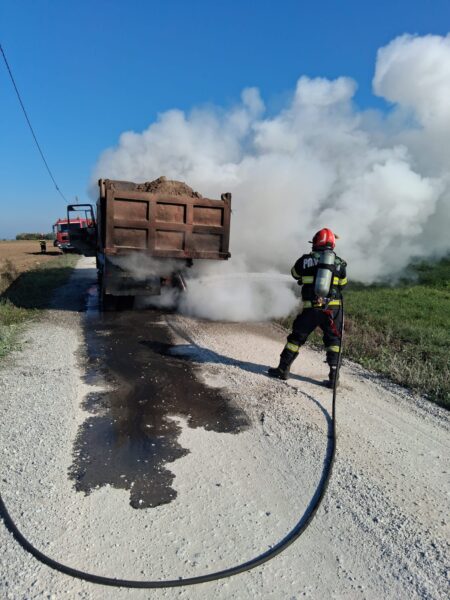 În cursul zilei de vineri, 17 octombrie, pompierii militari bihoreni au acționat pentru stingerea unui incendiu izbucnit la o autobasculantă aflată în mers, pe un drum comunal de pe raza localității Mărțihaz, comuna Mădăraș.