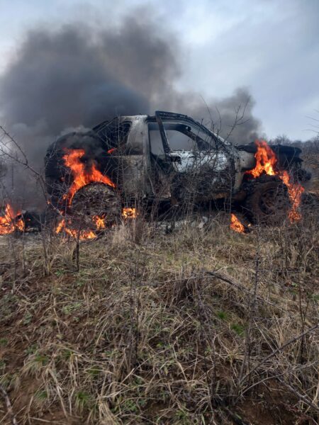 La sosirea echipajelor, flăcările se manifestau violent la nivelul întregului autovehicul, aflat pe un drum agricol, pe un deal din localitate.