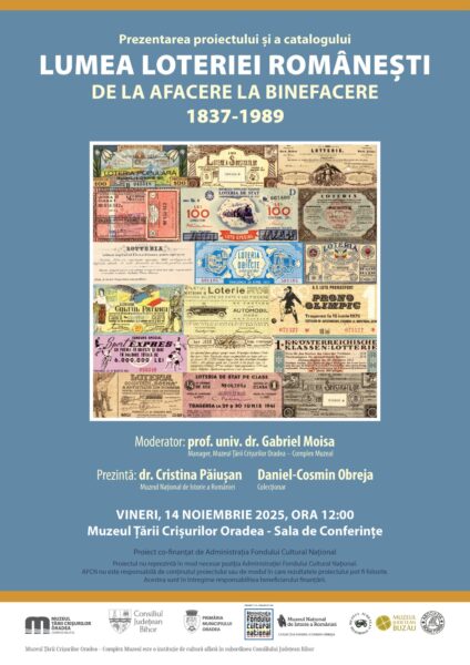 Muzeul Țării Crișurilor Oradea – Complex Muzeal organizează, cu sprijinul Consiliului Județean Bihor și al Primăriei Municipiului Oradea și împreună cu Muzeul Național de Istorie a României, Muzeul Județean Teleorman, Muzeul Județean Buzău, Asociația RoMilitaria și Colecția Daniel-Cosmin Obreja prezentarea proiectului și catalogului Lumea loteriei românești. De la afacere la binefacere 1837-1989. Evenimentul va avea loc vineri, 14 noiembrie 2025, ora 12.00, în Sala de conferințe a Muzeului Țării Crișurilor (Str. Armatei Române nr. 1/A).