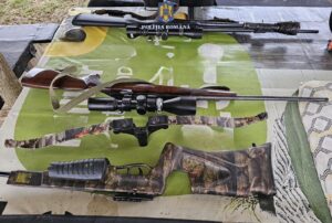 În urma perchezițiilor domiciliare efectuate, au fost descoperite și ridicate două arme letale lungi cu destinația vânătoare, dintre care una având seriile de identificare șterse, două arme letale confecționate artizanal, două arbalete, 49 de cartușe de diferite calibre, 382 de diabolouri, un amortizor, 5 săgeți, 34 de trofee, toate deținute ilegal.