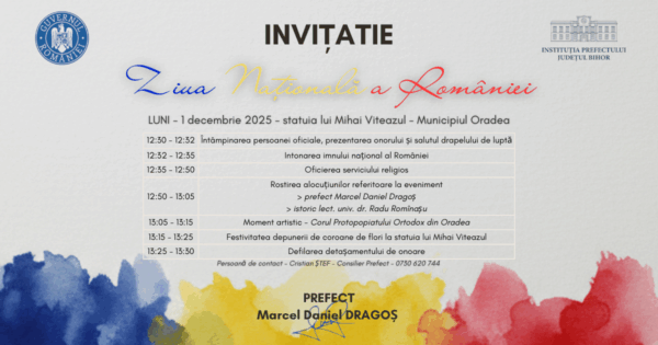 „În această zi simbolică de 1 decembrie celebrăm împlinirea idealului național de unitate, Instituția Prefectului Bihor subliniază importanța păstrării valorilor care stau la baza identității noastre: solidaritatea, democrația și angajamentul față de binele comun.
