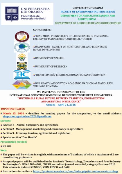 Universitatea din Oradea organizează, în 24 aprilie 2026, cea de-a cincea ediție a simpozionului științific internațional „Viitorul rural sustenabil, între tradiție, digitalizare și inteligență artificială”.