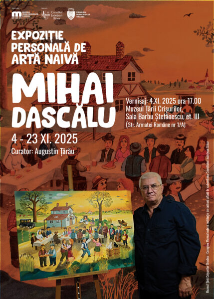 Muzeul Țării Crișurilor Oradea – Complex Muzeal, în parteneriat cu Consiliul Județean Bihor și Primăria Municipiului Oradea, organizează vernisajul expoziției personale de artă naivă Mihai Dascălu. Evenimentul va avea loc marți, 4 noiembrie 2025, ora 17.00, în Sala Barbu Ștefănescu a Muzeului Țării Crișurilor (Str. Armatei Române nr.1/A).