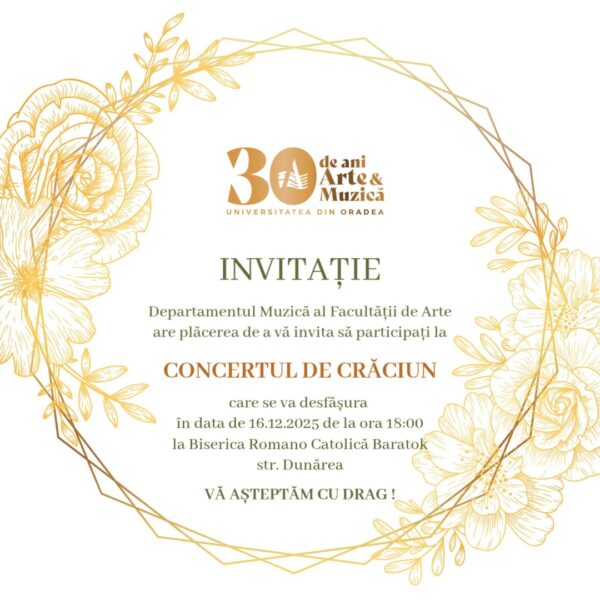 Concertul de Crăciun al Departamentului de Muzică din cadrul Facultății de Arte a Universității din Oradea va avea loc în data de 16 decembrie 2025, începând de la ora 18:00, la Biserica Romano-Catolică „Baratok”, de pe strada Dunărea.